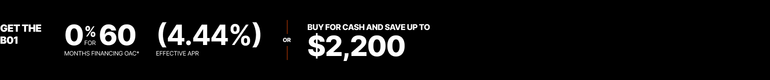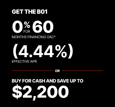 Representative finance example for the B2401DT: $21,158.72 financed at 0% (4.44% effective APR which factors in $2,050.58 in non stackable cash that cannot be combined with finance offers) equals $151.67 bi-weekly for 60 months. 130 payments required bi-weekly for 60 months. $2,190.79 down payment required. Cost of borrowing is $2,050.58 for a total obligation of $21,158.72. Financing available on approved credit. Prices and payments include freight and other applicable fees (including environmental fees, administration fees, set-up fees, and dealer fees on the model specified). Rebate of $2,000 available on cash purchases of a new B2301/B2401/B2401N only. Rebate of $2,200 available on cash purchases of other B01 models only. Offer valid until 03-31-2026.