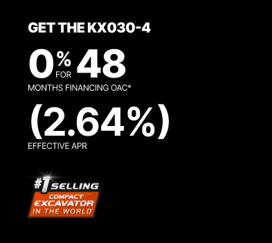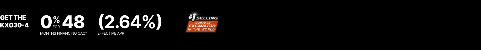 Representative finance example for the KX030-4: $66,597.33 financed at 0% (2.64% effective APR which factors in $3,116.76 in non stackable cash that cannot be combined with finance offers) equals $1248.7 monthly for 48 months. $6,659.73 down payment required. Cost of borrowing is $3,116.76 for a total obligation of $66,597.33. Financing available on approved credit. Prices and payments include freight and other applicable fees (including environmental fees, administration fees, set-up fees, and dealer fees on the model specified). Excavator Claim: "Kubota is the world’s #1 selling compact excavator for 20 years." Disclaimer: According to 2023 data from Off-Highway Research including all Kubota Group brand sales. Offer valid until {{date}}.