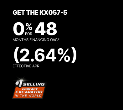 Representative finance example for the KX057-5: $118,641.26 financed at 0% (2.64% effective APR which factors in $5,552.41 in non stackable cash that cannot be combined with finance offers) equals $2224.52 monthly for 48 months. $11,864.13 down payment required. Cost of borrowing is $5,552.41 for a total obligation of $118,641.26. Financing available on approved credit. Prices and payments include freight and other applicable fees (including environmental fees, administration fees, set-up fees, and dealer fees on the model specified). Excavator Claim: "Kubota is the world’s #1 selling compact excavator for 20 years." Disclaimer: According to 2023 data from Off-Highway Research including all Kubota Group brand sales. Offer valid until 03-31-2026.