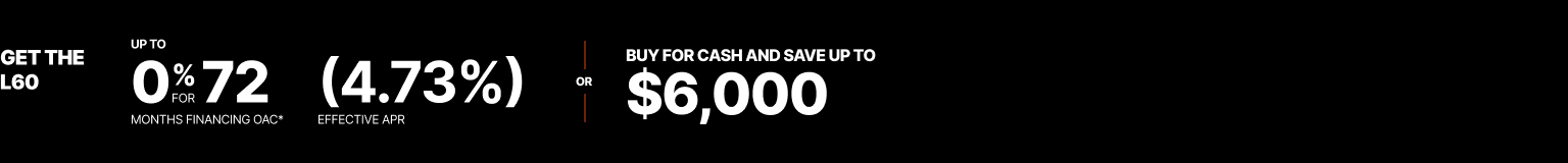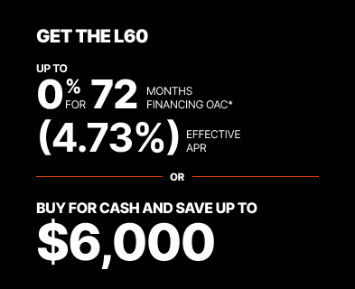 Representative finance example for the L3560HSTRC: $44,434.42 financed at 0% (4.73% effective APR which factors in $5,198.83 in non stackable cash that cannot be combined with finance offers) equals $256.35 bi-weekly for 72 months. 156 payments required bi-weekly for 72 months. $4,443.44 down payment required. Cost of borrowing is $5,198.83 for a total obligation of $44,434.42. Financing available on approved credit. Prices and payments include freight and other applicable fees (including environmental fees, administration fees, set-up fees, and dealer fees on the model specified). Rebate of $4,000 available on cash purchases of a new L3560/L4760 Rops only. Rebate of $4,500 available on cash purchases of a new L4060/L6060 Rops only. Rebate of $5,000 available on cash purchases of a new L4760 Cab only. Rebate of $5,500 available on cash purchases of a new L3560/L5460/L6060 Cab only. Rebate of $6,000 available on cash purchases of a new L4060 Cab only. 0% for 72 months financing available only on a new and previously unregistered L3560/L4060 Rops or Cab only. 0% for 48 months financing available only on a new and previously unregistered L4760/L5460/L6060 Rops or Cab only. Offer valid until 03-31-2026.