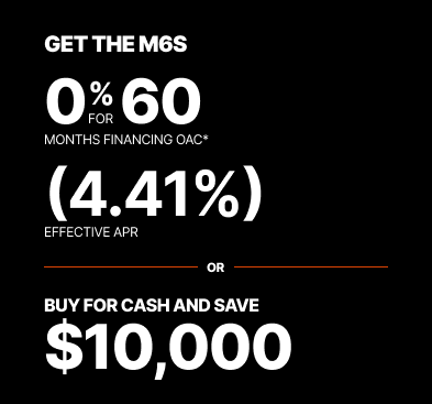 Representative finance example for the M6S-111SDS: $112,746.93 financed at 12% (4.41% effective APR which factors in $10,829.42 in non stackable cash that cannot be combined with finance offers) equals $1735.48 monthly for 60 months. $11,569.89 down payment required. Cost of borrowing is $10,829.42 for a total obligation of $112,746.93. Financing available on approved credit. Prices and payments include freight and other applicable fees (including environmental fees, administration fees, set-up fees, and dealer fees on the model specified). Rebate of $10,000 available on cash purchases of a new M6S only. Offer valid until 03-31-2026.