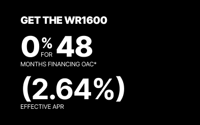 Representative finance example for the WR1600: $54,381.42 financed at 0% (2.64% effective APR which factors in $2,616.04 in non stackable cash that cannot be combined with finance offers) equals $1048.09 monthly for 48 months. $5,589.83 down payment required. Cost of borrowing is $2,616.04 for a total obligation of $54,381.42. Financing available on approved credit. Prices and payments include freight and other applicable fees (including environmental fees, administration fees, set-up fees, and dealer fees on the model specified). Offer valid until 03-31-2026.